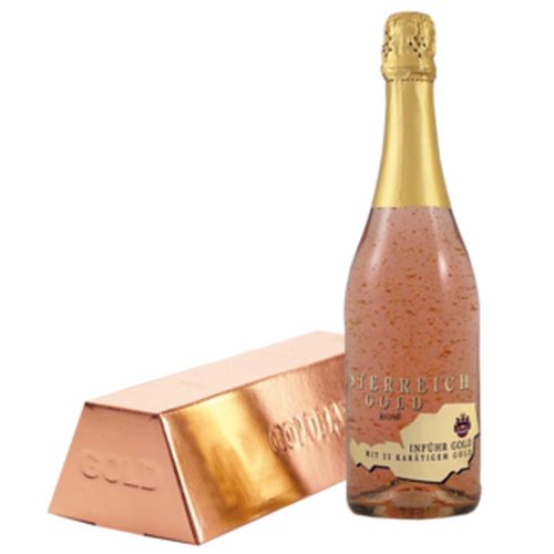 Tento jedinečný ochutený nápoj na báze vína obsahuje 23 karátové zlaté listy a ľahkú broskyňovú notu, často je hovorovo označovaný aj ako "Goldsekt". Ak je fľaša otočená hore nohami, v nápoji začína šumivý zlatý dážď. Táto vzácnosť medzi prestížnymi odrodami pozostáva z rakúskeho Zweigeltu. Osterreich Gold Rosé je ideálnym darčekom pre kultivovaného spotrebiteľa a korunuje vašu špeciálnu príležitosť zlatou korunou. S obsahom alkoholu 9,5% obj. Je ideálnym darčekom pre oslavy a udalosti alebo jednoducho pre krásne chvíle v každodennom živote. Zlato sa môže konzumovať bez toho, aby to ovplyvnilo vaše zdravie.